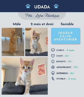 Je suis un petit chaton de 2 mois et demi roux tigré aux yeux bleus. Je suis de nature joueur, j’adore jouer avec mes deux frères Ustiti et Ulaoupe ! Je suis un petit chat qui déborde d’énergie! Mais j’adore aussi les caresses, d’ailleurs je ronronne assez facilement