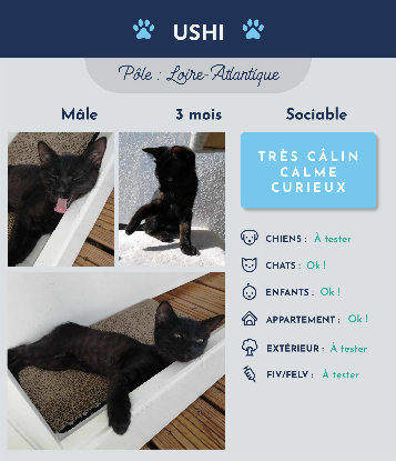 Hello, Je suis Ushi, un petit mâle de 3 mois au poil noir et légèrement tigré (avec un peu de blanc discret). Je suis très affectueux et très mignon. Je sais très bien comment attendrir les humains et j'ai un faible pour la pâtée.