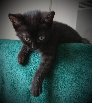 Dawn avec ses sœurs Ponyo et Flufy, et sa maman qui est sauvage. Sa maman était nourrie depuis quelques mois par sa famille d'accueil mais n'avait pas eu le temps d'être stérilisée quand la portée est arrivée sur la terrasse de la maison. La chatte et ses trois chatons ont été chassés de leur nid de naissance le jour même par un chat sauvage. Le soir même, un nid de fortune a été aménagé dans le jardin pour accueillir la petite famille. Quand les trois chatons ont eu 1 semaine, le temps pluvieux et les mâles qui rodaient ont poussé la famille d'accueil à les installer dans une pièce afin de les sécuriser et de commencer leur socialisation, et Moustache (la maman) les a suivis de son plein grès ! Son instinct maternelle est très fort.