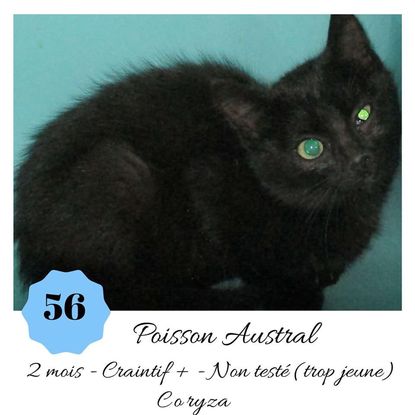 URGENCE EUTHANASIE ! Poisson Austral est un chaton de 2 mois craintif (en situation de fourrière) qui vous attend dans une fourrière du 56. ATTENTION SORTIE AU PLUS TARD LE 15/11/2019 (avant euthanasie) ! Pour adopter, c'est facile : ➡️ On se rend sur la page facebook d'Urgence Fourrière de Bretagne (UFB) -> https://www.facebook.com/sosfourrieresbreizh/ ➡️ On vient en message privé sur la page UFB ➡️ On remplit le questionnaire ➡️ Si le questionnaire est validé, on se rend disponible pour la pré-visite ➡️ On se rend aussi disponible pour venir chercher le loulou en fourrière Les chats sortent de fourrière primo-vaccinés et identifiés. Restera à charge de l’adoptant le rappel de vaccin et la stérilisation qui est OBLIGATOIRE. Les femelles en fourrière ayant été trouvées dans la rue, il y a fort à parier que nombre d'entre elles en âge de l'être soient gestantes ... ---- A PROPOS D'URGENCE FOURRIERE DE BRETAGNE (UFB) Nous sommes un COLLECTIF d'ASSOCIATIONS DE PROTECTION ANIMALE (qui rassemble notamment Moustaches et Compagnie, Bêtes de Scène, les Pachas, Chats Libres de Berné, etc, etc....) Le BUT de ce collectif d'associations est donc de SORTIR ces animaux des fourrières surchargées en les faisant ADOPTER de manière LEGALE par des familles ou en leur trouvant des FAMILLES D'ACCUEIL lorsque des places en association se libèrent.