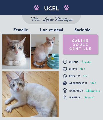 Salut, je suis la belle et douce Ucel, une adorable minette qui a 1 an et demi. J'aime les caresses et les câlins, vous ne pourrez pas vous asseoir sans que je vienne me coucher sur vos genoux. Avec moi, jamais un coup de patte ou de dents. Je suis un peu bavarde, si vous me parlez je vous repondrai en miaulant. Une partie de jeu de temps en temps n'est pas pour me déplaire