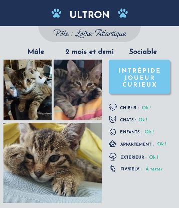 Bonjour, moi c'est Ultron. Je suis un petit mâle tigré de deux mois et demi. Nous avons été recueillis avec mon frère Unesko quand nous avions environ 6 semaines. Je suis un chaton qui n'a peur de rien (ou presque). Du coup ma socialisation a été très facile. Je suis extrêmement curieux, vif, espiègle. J'adore jouer et je suis une vraie machine à ronrons qui cherche les câlins dès que je veux me poser. Dans la maison où je suis actuellement il y a d'autres chats : des jeunes qui jouent avec moi, des vieux qui m'apprennent que je ne dois pas les embêter. Du coup j'apprends les codes des chats. Il y a aussi un gros chien et je n'en ai même pas peur (bon ok j'ai un peu feulé les deux premiers jours). Dans cette maison il n'y a pas d'enfants, mais j'aime tellement jouer que je suis sûr de m'entendre avec eux. Même si je ne connaissais pas la vie en appartement, je m’acclimate très bien. L'extérieur ne m'attire pas et je n'essaye pas de sortir. Je pourrais faire un parfait chat d'appartement si c'est l'endroit où vit la personne qui m'adopte.
