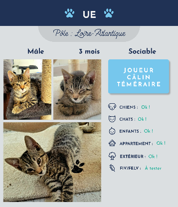 Bonjour les amis, Je me présente Ue, petit chaton de 3 mois. Je suis le compagnon idéal, le George Clooney à votre Julia Roberts, et aussi beau gosse, avouons-le ! Hyper sociable, je joue avec tout et tout le monde mini humain, chat, chien... j'aime tout le monde si on n'est pas trop brusque et qu'on me laisse un petit temps d'observation. Sinon je me trouve un petit coin tranquille et j'appelle mes frères et sœur, parce qu'avec un peu de compagnie plus rien ne me fait peur. Alors si je pouvais être adopté avec un de mes frères ou ma sœur ce serait idéal. Mais ne dites pas que je ne suis pas courageux (ou joueur ahah), je monte sur le labrador de ma famille et je vais faire un tour sur son dos quand je veux. Et attention bougonnement ou pas, je ne lui laisse pas le choix haha c'est moi le patron ! Joueur, sociable et j'adore les caresses mais j'aime bouger sous vos mains pendant un bon moment avec de me poser pour la sieste. J'ai remarqué que les câlins étaient plus longs comme ça, malin comme je suis !