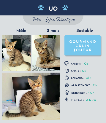 Salut la compagnie, Moi c'est Uo, chaton de 3 mois, je suis le plus grand de ma portée, c'est moi l'homme (enfin le chat) de la maison (ou presque). Gourmand comme tout, donnez- moi à manger et je serai votre meilleure ami. Mais attention ne penser pas que je passe mon temps à manger, je suis très actif et j'adore jouer avec mes frères et sœur en courant et explorant mon environnement. Avec oui une petite bêtise par ci par là (un chaton quoi ahah). Et bien qu'il m'arrive de me mettre à la fenêtre pour regarder les nuages et les oiseaux, je suis un gros bosseur. Comme vous pouvez le voir, ordinateur et imprimante n'ont aucun secret pour moi, un vrai petit geek. Ma famille d'accueil m'a même fait mon petit coin sur le bureau. Par contre, attention aux traces de pattounes car je ne connais pas la notion d'espace personnel... l'imprimante en est la preuve hihi. Alors si vous voulez une bouillotte qui ronronne comme un p’tit moteur pendant vos journées télétravail ou soirée télé, venez me rencontrer !