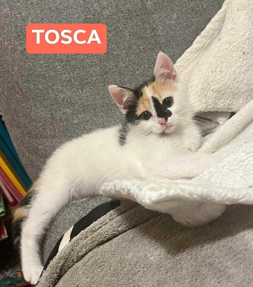 Chatonne de 2 mois et demi, gourmande et très joueuse. A apprécié prendre la pause pour la séance photo. Encore un peu réservée avec l’homme mais bien dans ses patounes, c'est la plus aventureuse de sa sororie.
