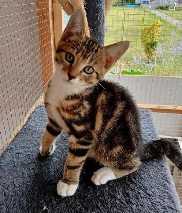 ULNA est une chatonne tigrée et blanche avec des petits chaussons blancs