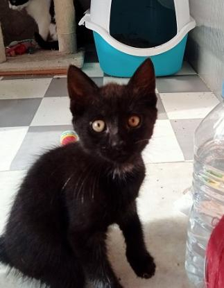 ULPIA est une chatonne noire avec une tâche blanche, trouvée dans la rue avec ses deux frères et son adorable maman qui nous cherchait de la nourriture désespérément.