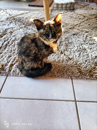 Elle a 11 semaines. Elle est très câline et joueuse; étant donné qu'elle vient de dehors, nous préférons pour elle une personne avec un extérieur (maison ou rez de jardin)