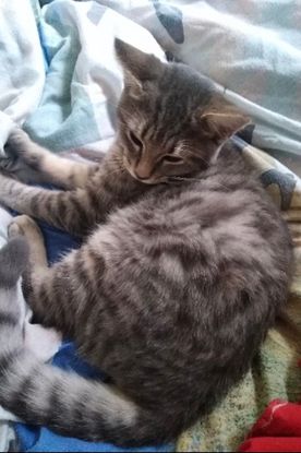 4,5 mois - Ce joli minou tigré gris a été pris en charge suite au décès d’une personne ayant plusieurs chats. Il est né entre juin et juillet 2019. Il est très sociable, habitué aux enfants, chats et chiens. Il aura besoin d’un jardin. Un don est demandé pour chaque adoption.