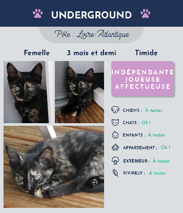 Hello, Je suis Underground, une femelle tricolore de 3 mois et demi. Je suis de petite taille, indépendante. Timide, j'aime tout de même les câlins et je ronronne vite !