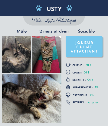 Bonjour, je m'appelle Usty et je suis un magnifique chaton tigré âgé de 2 mois et demi. Je suis très à l'aise, pas du tout timide et très bien dans mes pattes. J'ai l’habitude de vivre avec plusieurs chats et je m'entends très bien avec les autres animaux, je peux être adopté sans copain car je suis déjà indépendant. Je m’entendrai bien avec les enfants. D'une nature relativement calme, j'ai aussi mes moments de folie comme n'importe quel chaton. Je peux vivre en appartement ou en maison, cela n'a pas grande importance : je ne suis pas du tout intéressé par l'extérieur pour le moment. Rejoindre votre famille serait une chance incroyable pour moi.