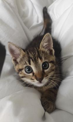 DARCY est née début Mai. Elle a été trouvée dans le centre-ville du bourg de St-Pierre-de-Glesguen par 2 particulières. Elles ont tenté de retrouver la mère, d’autres chatons et d’éventuels propriétaires mais les recherches n’ont rien donné.