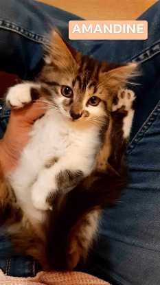 AMANDINE 3 mois, chatonne timide et très curieuse, très joueuse aussi. Peut-être adoptée seule ou avec un compagnon de son âge.
