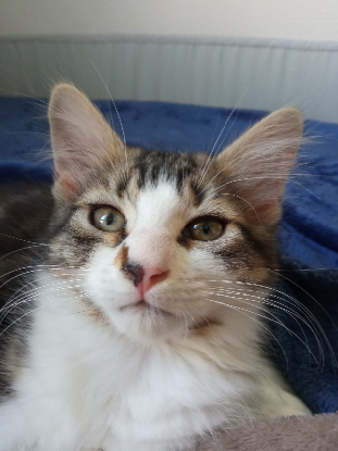 Nuage est le plus câlin de la fratrie. Il est gentil et ne montre aucune agressivité. Il est joueur et apprécie la compagnie humaine. Il se laisse caresser, mais il est encore un peu craintif. Il a la queue entre les pattes quand il est pris à bras, et quand il est reposé. Il s'améliore progressivement. En effet, depuis quelques jours, il ronronne sur le canapé, et se laisse de plus en plus caresser.