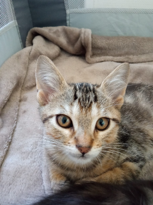 Poumba est un petit chaton très joueur, tout comme sa sœur Bulle. Il est un peu craintif mais pas du tout agressif. Il aime les caresses avec parcimonie mais il progresse. Il est encore tendu si on le prend à bras et fuit quand quelqu'un vient vers lui. La famille d'accueil travaille sur cela.