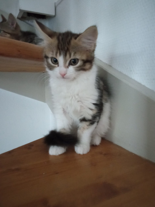 Romy est une petite minette très joueuse. Elle n'est pas du tout agressive mais elle peut feuler facilement. Une fois dans le parc à moitié endormie, on peut la caresser sans problèmes. Il lui faudra des adoptants patients et qui ont une pièce isolée où ils pourront continuer la socialisation.