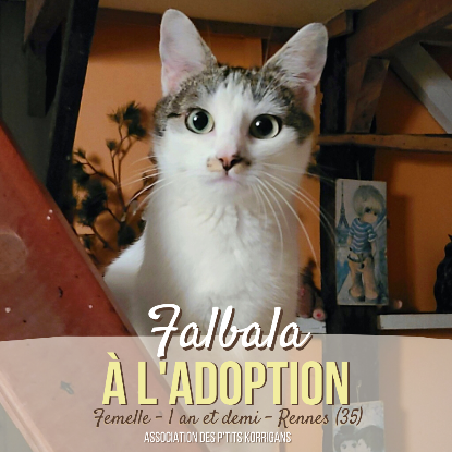 Falbala est une très jeune chatte très câline, sociable et ronronneuse qui était abandonnée et errante dans un grand quartier de Rennes, où elle enchaînait les portées, cachées dans les buissons. Sa dernière portée n'a jamais été retrouvée, ils sont sans doute tous morts... Très méfiante sur son parking, elle ne faisait pas confiance aux bénévoles pour la prendre avec les mains. Elle a donc été capturée avec difficulté car cette petite maline a très vite compris à quoi sert une cage et n'arrivait pas à faire confiance, trop habituée à vivre dans la peur et à survivre...