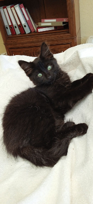 Cette petite chatte aux poils angoras, noirs avec quelques reflets marrons ne peut que vous faire craquer, c'est un véritable petit ange.