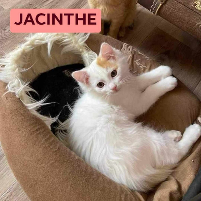Chatonne blanche et quelques touches de roux sur la tête et la queue, est une petite canaille qui adore jouer avec tout ce qu’elle trouve ! Des de jeux vous permettrons de créer du lien avec elle