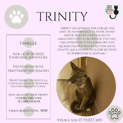 Femelle avec 3 pattes apparue avec sa patte blessée sur l'un de nos sites de nourrissage. Après opération et soins, Trinity est prête à trouver sa famille pour la vie.