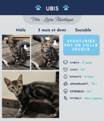 Bonjour, moi c'est Ubis chaton de 3 mois et demi. Vous allez forcément m'aimer : je suis très équilibré et je ne demande qu'à donner de l'amour et en recevoir. Je suis un petit pot de colle qui demande tout le temps des caresses, je viens me frotter à vous sans hésiter parce que j'adore les humains. Je suis très joueur et je ne compte plus mes moments de folie. Si vous voulez me voir grandir avec vous alors contactez ma super asso : ma famille d'accueil se fera un plaisir de me présenter.