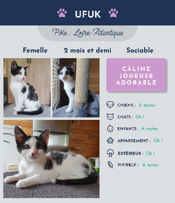Salut, je suis Ufuk, une petite minette super sociable de 2 mois et demi. J'adore les humains, que ce soit pour jouer ou faire des câlins. Je ronronne dès qu'on s'occupe de moi. Je m'entend très bien avec les autres chats mais je suis très dynamique et je veux toujours jouer avec eux. Je suis à la recherche d'une famille pour la vie.