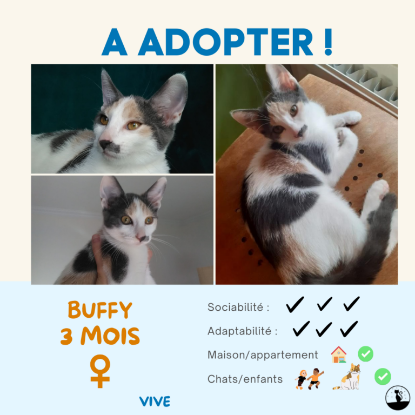 Buffy est une très jolie minette, aux couleurs tricolores Buffy ne se fait pas attendre pour montrer à ses humains son amour : très câline, elle vous remplira d’amour ! Mais aussi, la louloute est très joueuse et dynamique, une vraie boule d’énergie ! Enfin, Buffy se laisse volontiers porter dans les bras, elle est une chatoune vraiment adorable