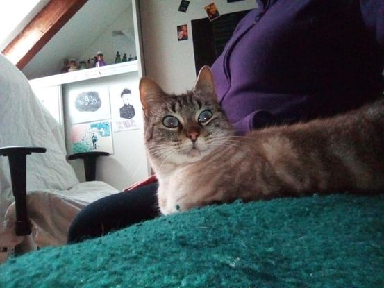 Niniblue est une minette "à genoux", elle s'y installe volontiers à la moindre occasion, elle adore les caresses et est assez à l'aise dans les bras. Elle est assez calme, n'a pas commencé à jouer pour l'instant mais a montré un peu d'intérêt pour une balle ;-)