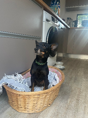 P'tibou est un petit chien mâle type pinscher qui est âgé de 2 ans et qui pèse 4 kilos 800 (taille d'un chat). Il se trouve actuellement sur l'île de la Réunion et arrivera chez Association Erka, jamais sans Toit le 23 août.
