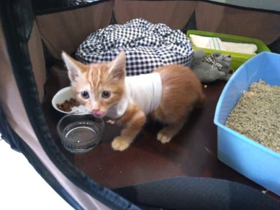 À l'adoption Papaye 4 mois, petit mâle roux trouvé blessé et amputé d'une partie de sa patte avant. Affectueux, joueur et bavard, il s'entend bien avec ses congénères et vit très bien son petit handicap.