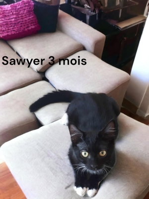 Sawyer est un adorable petit chaton de 5 mois, il très câlin et très joueur. Il sera de bonne compagnie pour un autre chat joueur. Il est Propre.