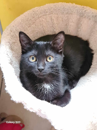 Elle aime jouer et adore la gamelle... C'est une adorable minette avec une robe magnifique quelque peu peureuse encore pour le moment.