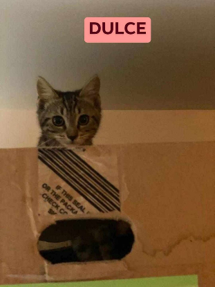 DULCE superbe chatonne tigrée de 3 mois. Elle est douce et calme et aime jouer avec les autres. Elle est encore timide avec l'humain préférant l'observer depuis les hauteurs.