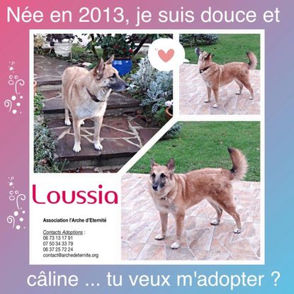 Loussia est une crème de louloute, douce, câline, s'adapte assez vite, à tout environnement, humains, chiens croisés en extérieur, bruits etc.. Quelques petites appréhensions dont elle se rassure de suite (aboiement extérieur..) Est propre en intérieur.. Assez gourmande ! (Normal ;) non !?!) Le chat de la famille n'accepte pas du tout Loussia, ce qui pose problème dans le sein du foyer, quel dommage ! Loussia l'accepte et le respecte pourtant.. Plus qu'à lui souhaiter un bon foyer avec ou sans chat où Loussia n'aura que de l'amour à offrir.. Une superbe chienne de famille vous attend !!
