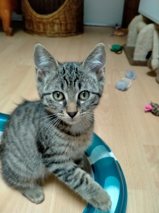 C'est un goulu, il avale son assiette d'un trait et finit volontiers celle de sa soeur Ula . C'est un chaton très propre dont l'âge est estimé à 3 mois