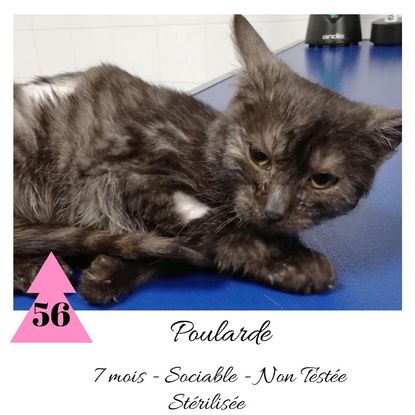 URGENCE EUTHANASIE ! Poularde est une minette de 7 mois sociable qui vous attend dans une fourrière du 56. ATTENTION SORTIE AU PLUS TARD LE 5/12/2019 (avant euthanasie) ! Pour adopter, c'est facile : ➡️ On se rend sur la page facebook d'Urgence Fourrière de Bretagne (UFB) -> https://www.facebook.com/sosfourrieresbreizh/ ➡️ On vient en message privé sur la page UFB ➡️ On remplit le questionnaire ➡️ Si le questionnaire est validé, on se rend disponible pour la pré-visite ➡️ On se rend aussi disponible pour venir chercher le loulou en fourrière Les chats sortent de fourrière primo-vaccinés et identifiés. Restera à charge de l’adoptant le rappel de vaccin et la stérilisation qui est OBLIGATOIRE. Les femelles en fourrière ayant été trouvées dans la rue, il y a fort à parier que nombre d'entre elles en âge de l'être soient gestantes ... ---- A PROPOS D'URGENCE FOURRIERE DE BRETAGNE (UFB) Nous sommes un COLLECTIF d'ASSOCIATIONS DE PROTECTION ANIMALE (qui rassemble notamment Moustaches et Compagnie, Bêtes de Scène, les Pachas, Chats Libres de Berné, etc, etc....) Le BUT de ce collectif d'associations est donc de SORTIR ces animaux des fourrières surchargées en les faisant ADOPTER de manière LEGALE par des familles ou en leur trouvant des FAMILLES D'ACCUEIL lorsque des places en association se libèrent.