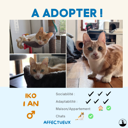 Iko est un très beau rouquin, aussi beau que gentil D’une gentillesse incomparable, Iko est un chat très doux, avec un caractère très affectueux. Le loulou est un chat plutôt calme, il aime faire de longue sieste, regarder par la fenêtre, et puis de temps en temps jouer avec ses copains chats. Iko ne fait aucune bêtise, sauf peut-être chercher les cachettes des friandises