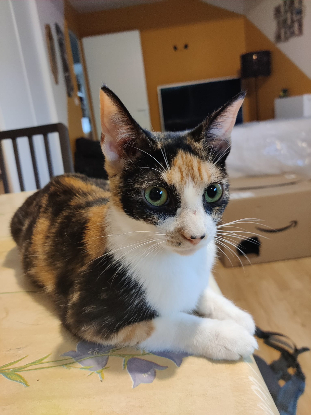 Maintenant je vis avec des humains au pays des merveilles ! Je les aime tous, petits, grands, inconnus, pourvu qu'on me caresse. Preuves de mon amour, j'accueille les invités à la porte, je vous attends le matin au réveil pour le rituel du câlin fée-lin, et si j'estime que cela doit durer plus longtemps, j'use de ma papatte magique et douce pour vous tapoter. J'aime tellement les humains que lorsque j'ai mis bas, je suis allée les chercher pour me rassurer.