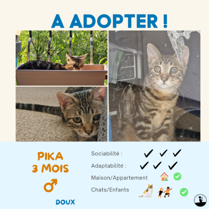 Pour Pika nous cherchons une famille très présente. Pika est compatible avec ses congénères chats, et aussi les enfants. Il demandera simplement beaucoup de présence et ne pourra pas se retrouver seul en journée.