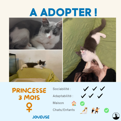 Princesse est une chatoune magnifique Au-delà de sa beauté, elle est aussi extrêmement vive et curieuse de tout. Elle adore chasser les insectes, grimper aux arbres à chats, courir après son frère Globule. Princesse a beaucoup d’énergie, c’est une grande joueuse Très sociable, elle aura aussi besoin de moments de complicité avec enfants ou adultes.