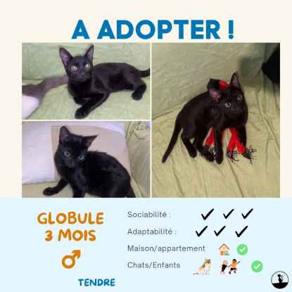 Pour Globule nous cherchons une famille très présente. Globule est compatible avec ses congénères chats, et pourra vivre heureux avec des enfants. Il aura besoin de beaucoup de présence et ne pourra pas se retrouver seul en journée.