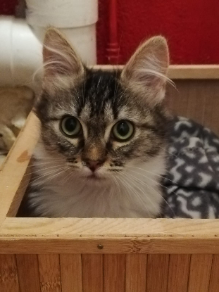 Uja est une petite chatonne craintive mais qui apprécie les caresses dans son panier. Elle ronronne et se tourne pour qu'on la gratte .