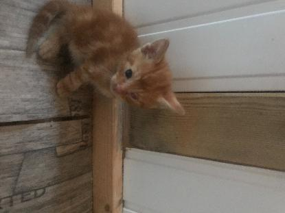 C'est le plus adorable de sa fratrie... Probablement du à son oeil en moins, il n'a pas du tout appris à se méfier des humains et ne réclame que des câlins. Il a été piégé à l'âge de 3 semaines avec sa maman sauvage et sa fratrie. Nous avons donc pu soigner le 2ème oeil et limiter les dégats mais il en avait déjà perdu un.