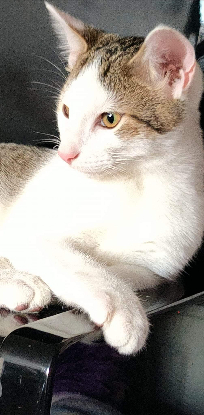 Voici Ulysse, mâle de 5 mois. Bien "sociabilisé", joueur, câlin et bien dans ses patounes. Il aimerait vite sa famille d'adoption pour pouvoir se poser et donner tout son amour... Il est haut sur pattes, très légère faiblesse du train arrière à peine perceptible (en tous cas sans conséquence sur sa santé et sa vie de chat).