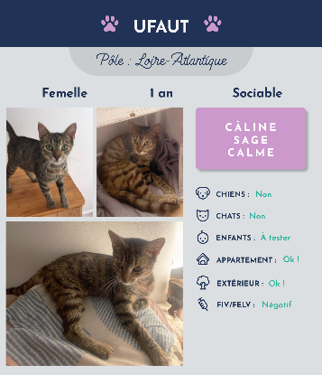Bonjour, moi c’est Ufaut, j’ai environ 1 an et je suis une petite femelle . Je suis une chatte très joueuse ! J’adore les appartements comme les maisons mais je n’aime pas les autres animaux. Je suis une chatte très câline et je m’adapte très vite, j’adore dormir avec les gens et faire plein de câlins… je suis très calme et très sage ! Je cherche donc une famille aimante qui saura me donner l’affection que je recherche. J’espère que ma description vous aura séduit et j’ai hâte de vous rencontrer !