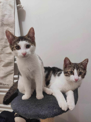 Histoire: Nés d'une maman sauvage stérilisée et relâchée sur site, Mini Boule et Crevette ont rejoint l'association afin d'être sociabilisés et d'avoir la chance de rencontrer une belle famille...