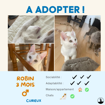 Pour Robin nous cherchons une famille très présente. Pour son épanouissement, nous souhaiterions que la famille adoptive ait au moins un chat déjà présent à la maison. Enfin, Robin ne pourra pas rester seul en journée.