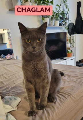 Chaglam est une très belle chatte de 2 ans couleur gris foncé, très douce et câline, elle s'adapte très vite à son nouvel environnement.