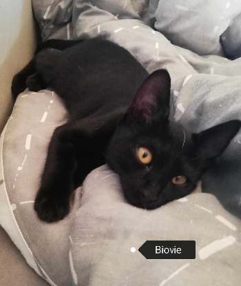Biovie, 4 mois, joueuse douce aime dormir sur les genoux ou à côté de son humain. Peut vivre avec un autre chat. Famille avec enfants possible.