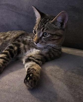 Gribouille petit minet de 4 ou 5 mois. Il est plein de vie, câlin et proche de l'humain. S'entend avec les chiens, chat pas testé.